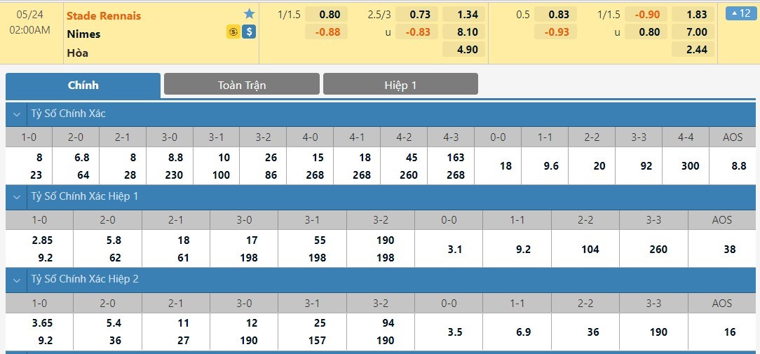 Tip kèo tỷ số hiệp 1: Rennes 2-1 Nimes