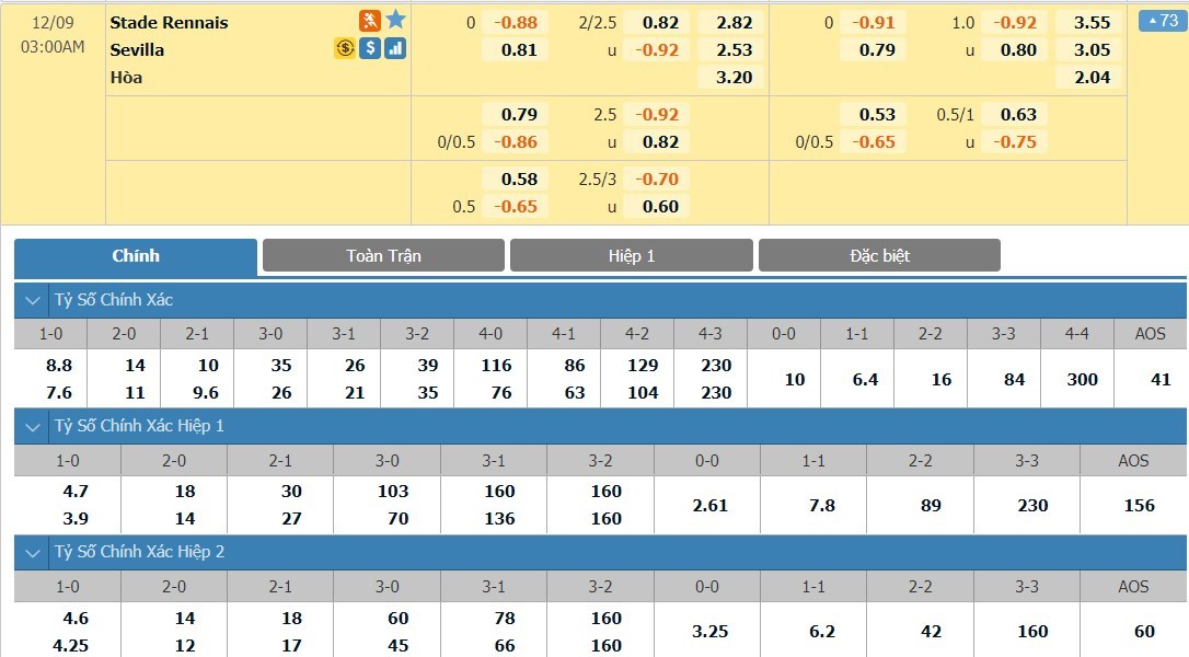 Tip kèo tỷ số hiệp 1: Rennes 0-0 Sevilla