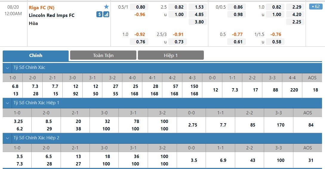 Tip kèo tỷ số hiệp 1: Riga FC 0-0 Lincoln Red Imps FC