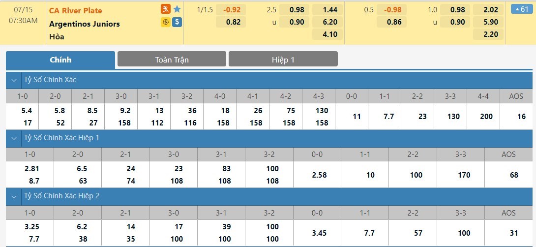 Tip kèo tỷ số hiệp 1: River Plate 0-0 Argentinos Juniors