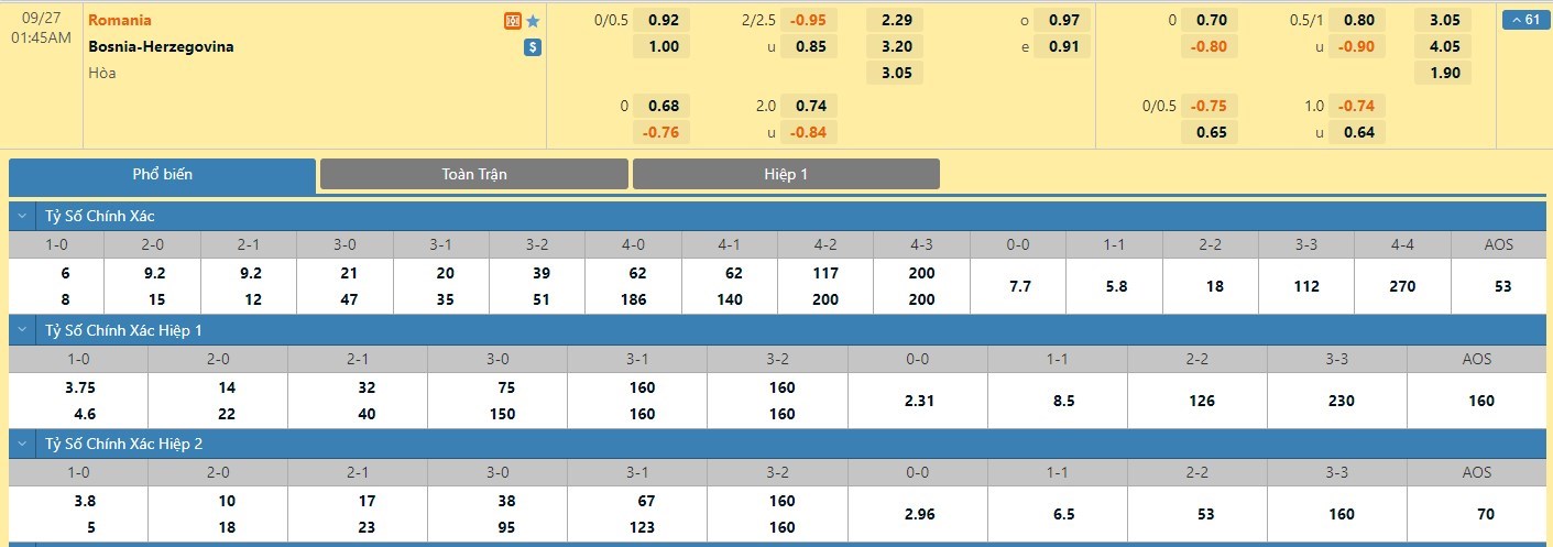 Tip kèo tỷ số hiệp 1: Romania 0-0 Bosnia Herzegovina