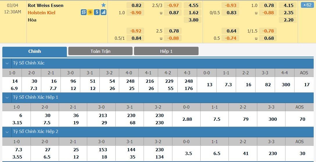 Tip kèo tỷ số hiệp 1: Rot Weiss Essen 1-1 Holstein Kiel