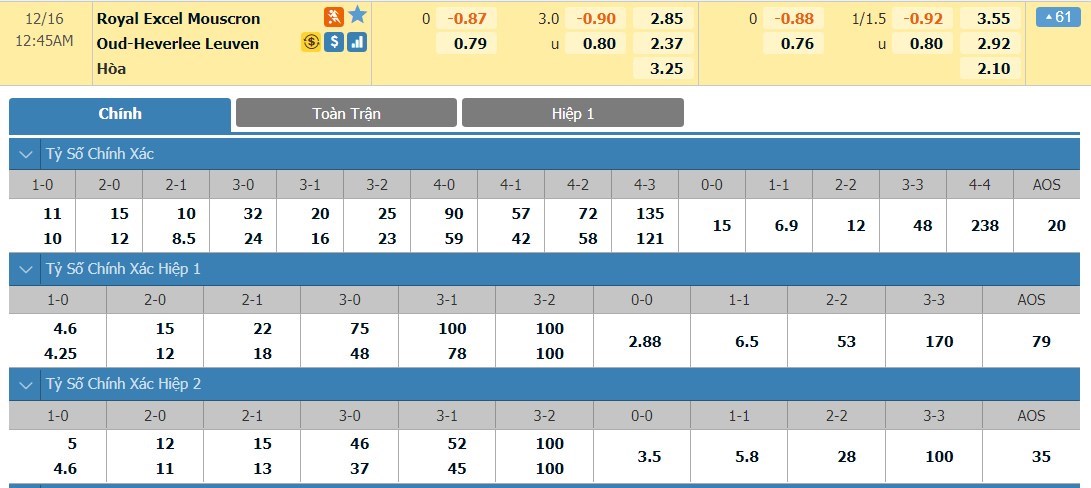 Tip kèo tỷ số hiệp 1: Royal Excel Mouscron 0-0 OH Leuven
