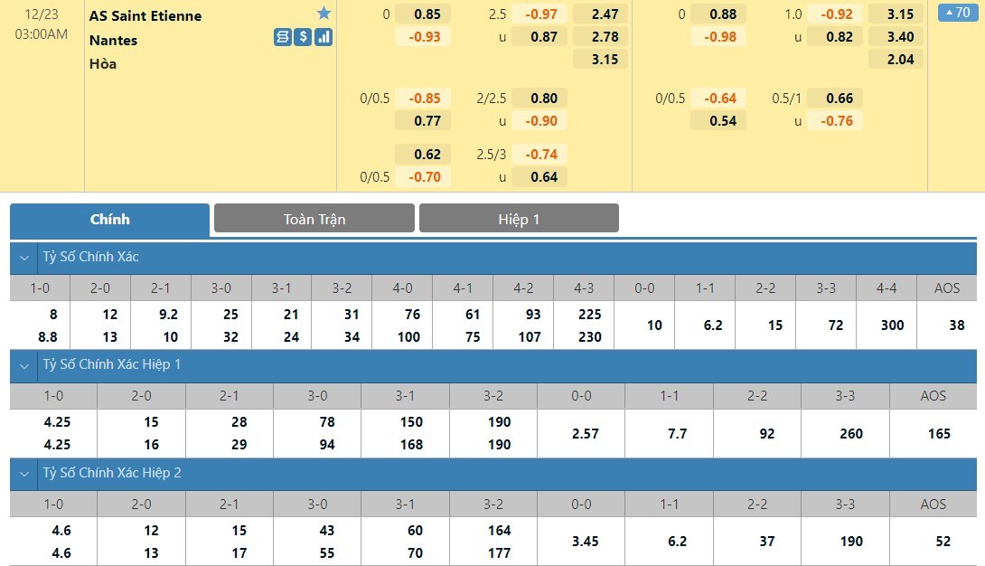 Tip kèo tỷ số hiệp 1: Saint-Etienne 0-0 Nantes