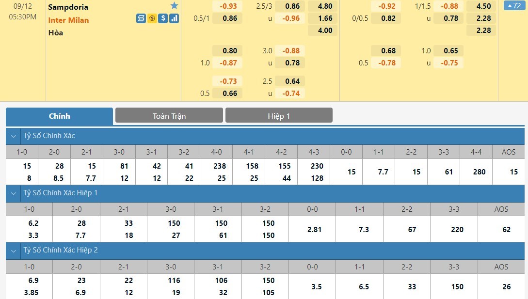 Tip kèo tỷ số hiệp 1: Sampdoria 0-0 Inter Milan
