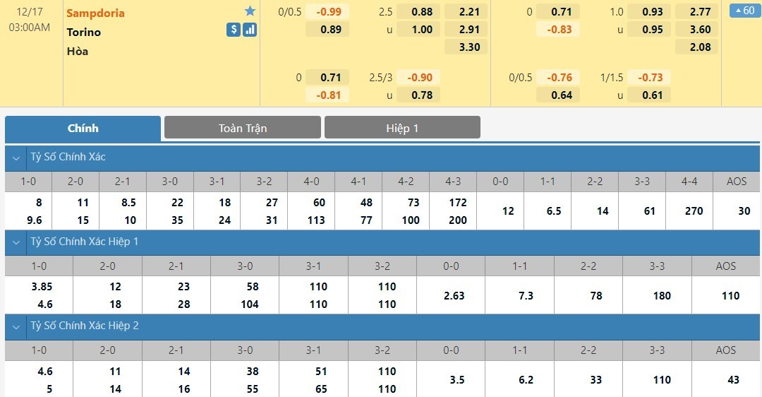 Tip kèo tỷ số hiệp 1: Sampdoria 0-0 Torino