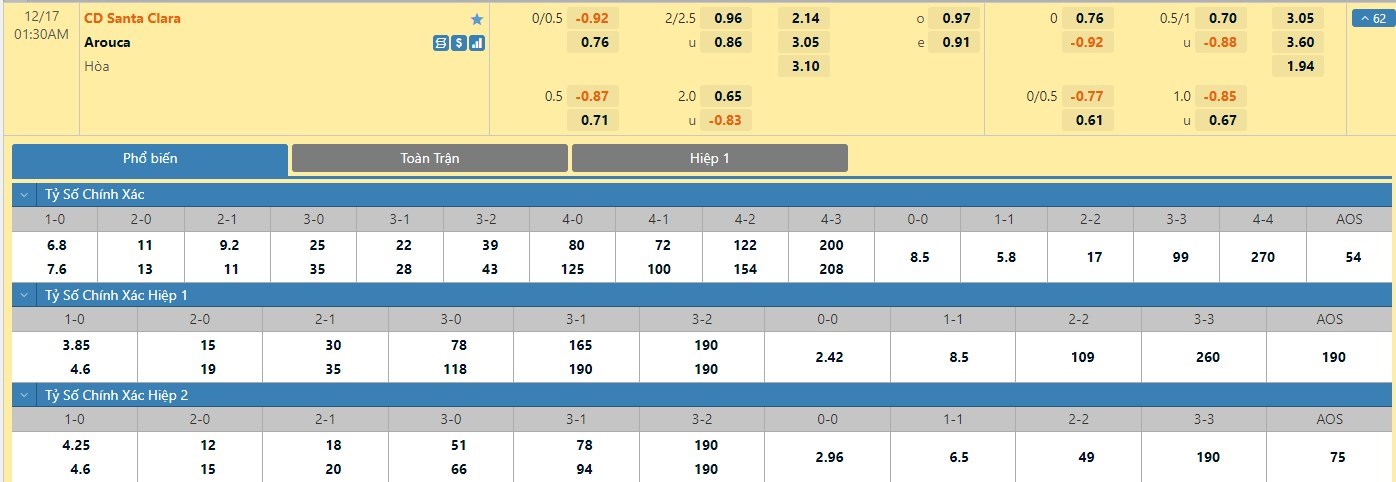 Tỷ lệ kèo ở trận đấu này được đưa ra là -1/4 trái nghiêng về Arouca và tỷ lệ này là có phần bất ngờ. Bởi lẽ nếu đánh giá dựa theo phong độ thì chính đội khách đang mới là những người có màn thể hiện tốt hơn. Cụ thể, Santa Clara không thắng trong 3 trận gần nhất (hòa 1, thua 2). Bên phía đối diện, Arouca lại không thua trong 8 trận gần nhất chơi trên sân khách. Ngoài ra ở 5 trận đấu gần nhất hai đội bóng này đối đầu nhau thì Santa Clara mới là đội sở hữu thành tích thi đấu tốt hơn. Các nhà đầu tư nên tin tưởng vào đội khách ở trận đấu này để mang về cơ hội thắng kèo cao hơn. Trong 5 trận đấu gần nhất đôi bên đụng độ nhau trực tiếp, Santa Clara đã có 2 trận đấu mang về được cho mình ít nhất là 1 bàn thắng trong hiệp đấu đầu tiên. Còn với Arouca, đội bóng này đã có 2 lần làm được điều này trong 45 phút đầu tiên.