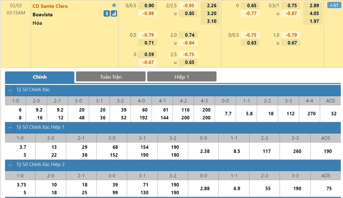 Tip kèo tỷ số hiệp 1: Santa Clara 0-0 Boavista
