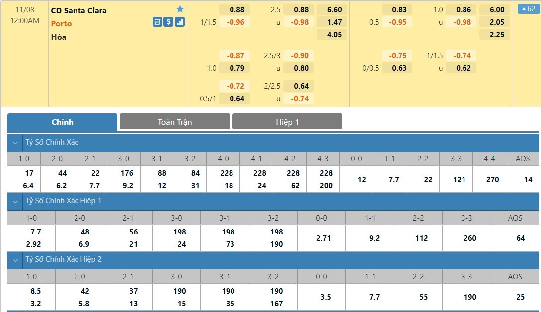 Tip kèo tỷ số hiệp 1: Santa Clara 0-2 FC Porto