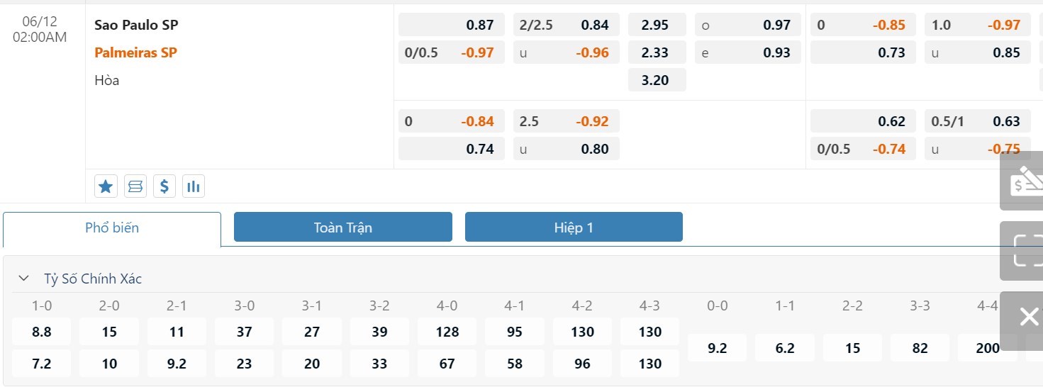 Sao Paulo dù chơi trên sân nhà trong trận này nhưng họ vẫn phải chấp nhận thân phận của đội chiếu dưới. Rõ ràng là phong độ trái ngược của hai đội trong quãng thời gian gần đây có sự ảnh hưởng đến cách nhìn nhận của đội ngũ chuyên môn. Palmeiras là đội chiếu trên chấp tỷ lệ -1/4 trái kèo đấu này. Thành tích ổn định trên sân khách của Palmeiras chính là thứ vũ khí khiến họ tự tin trong chuyến hành quân sắp tới đến gặp Sao Paulo.