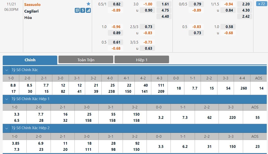 Tip kèo tỷ số hiệp 1: Sassuolo 1-0 Cagliari