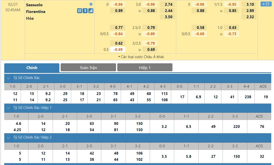 Tip kèo tỷ số hiệp 1: Sassuolo 1-1 Fiorentina