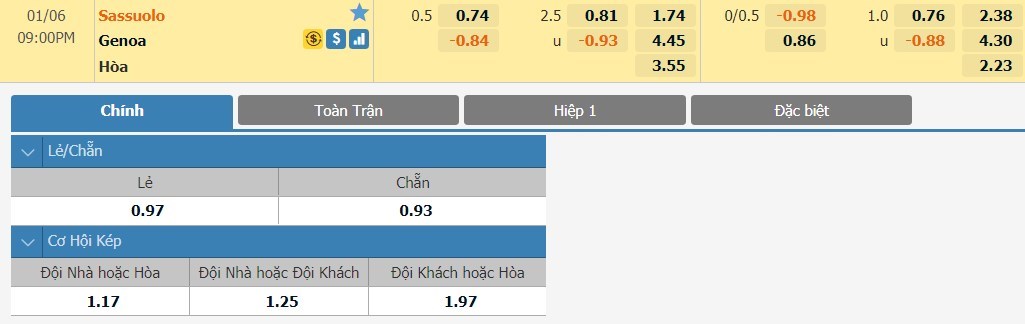 Tip kèo tỷ số hiệp 1: Sassuolo 1-1 Genoa