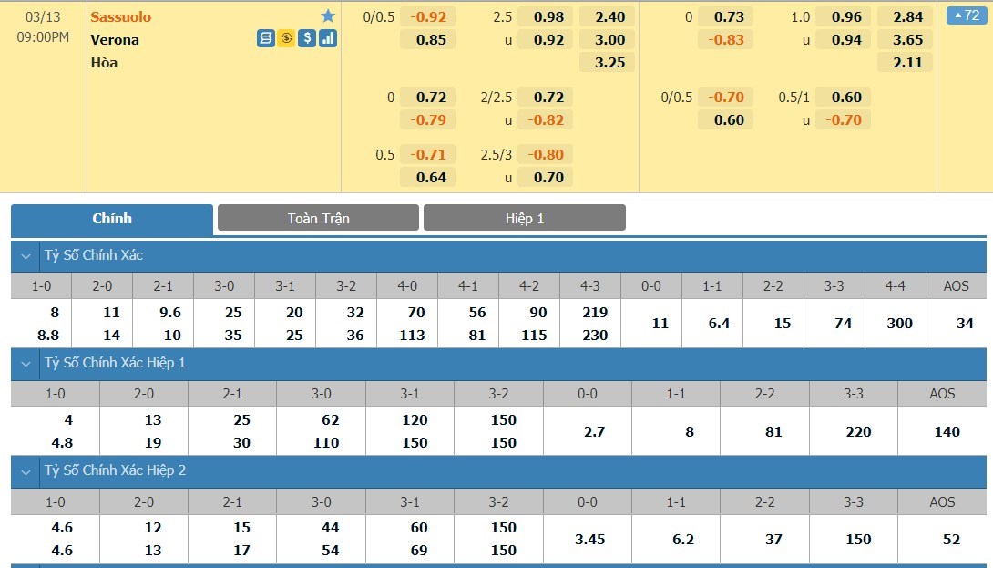 Tip kèo tỷ số hiệp 1: Sassuolo 0-0 Hellas Verona