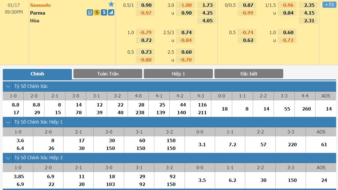 Tip kèo tỷ số hiệp 1: Sassuolo 2-0 Parma