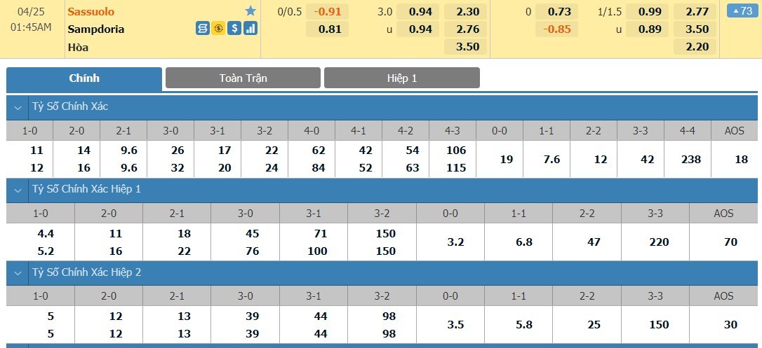 Tip kèo tỷ số hiệp 1: Sassuolo 1-0 Sampdoria