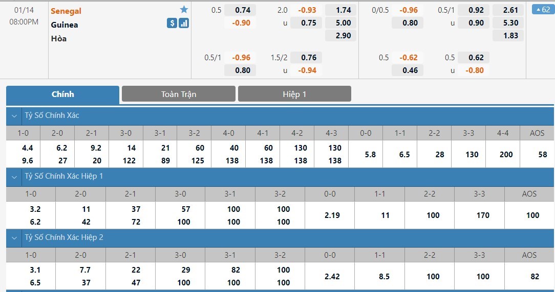 Tip kèo tỷ số hiệp 1: Senegal 2-0 Guinea