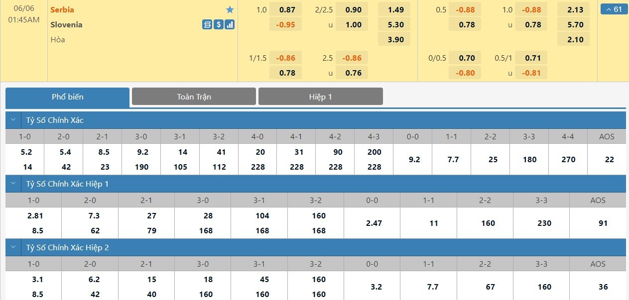 Tip kèo tỷ số hiệp 1: Serbia 1-0 Slovenia