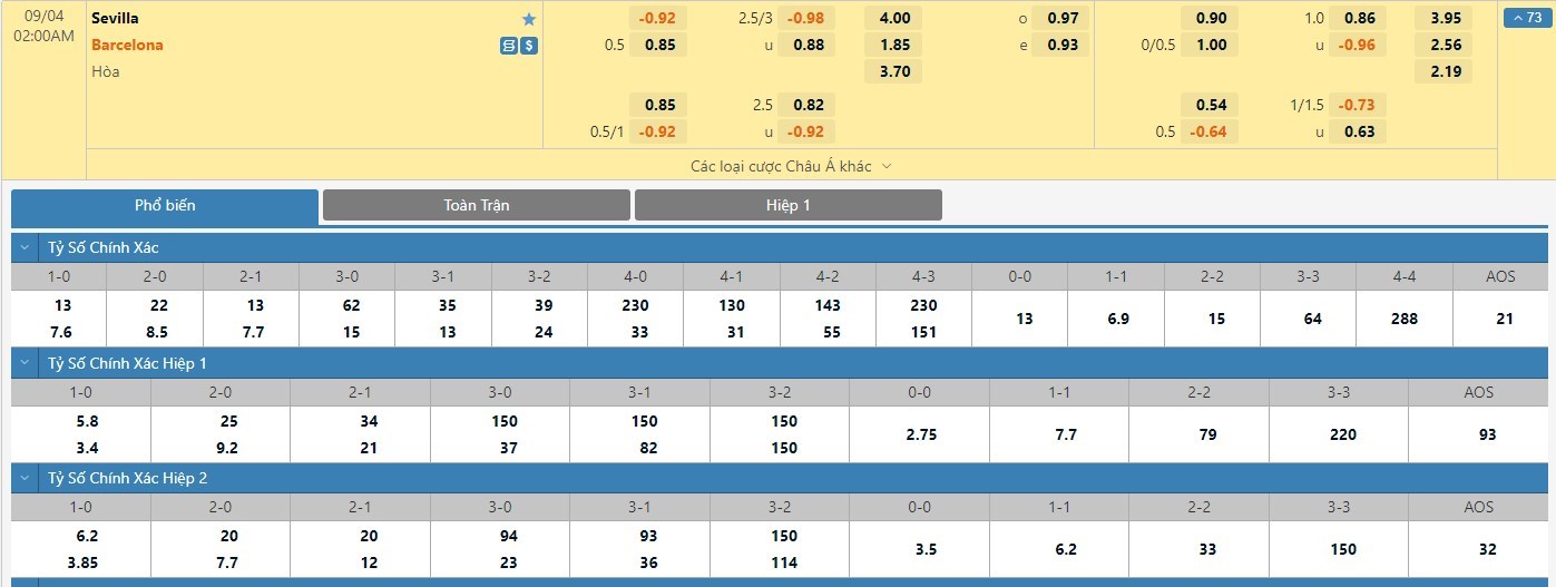 Trong 5 trận đấu gần nhất của mình, Sevilla đã có 2 trận đấu mang về được cho mình ít nhất là 1 bàn thắng trong hiệp đấu đầu tiên trong khi Barcelona đã có 4 lần làm được điều này. Tỷ lệ kèo hiệp 1 ở trận đấu này được đưa ra là Barcelona chấp tỷ lệ -1/4 trái và người chơi nên tin tưởng vào đội khách.