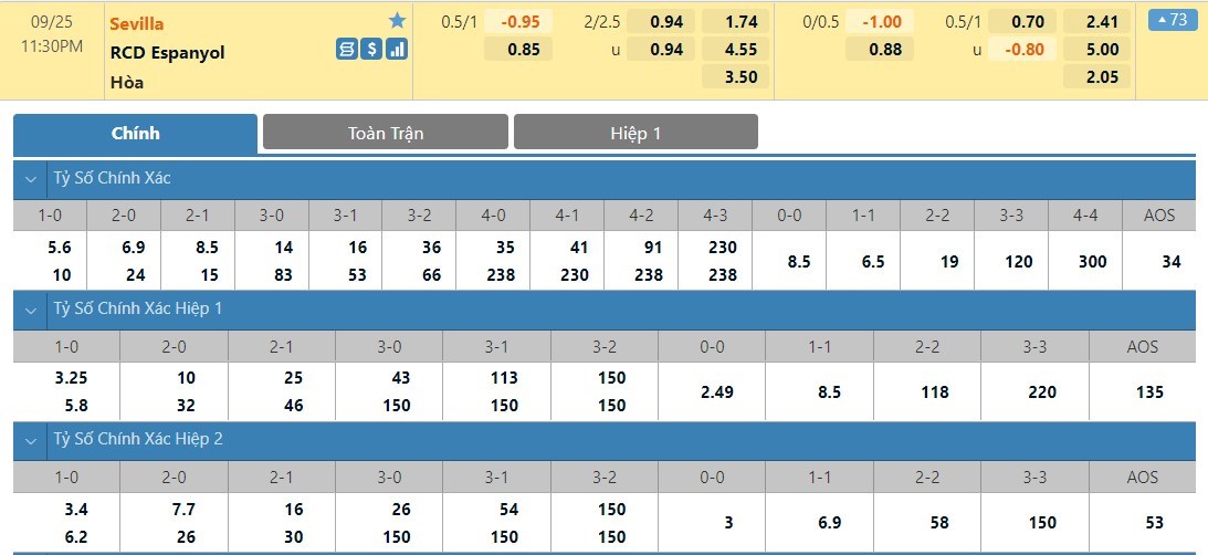 Tip kèo tỷ số hiệp 1: Sevilla 1-0 Espanyol