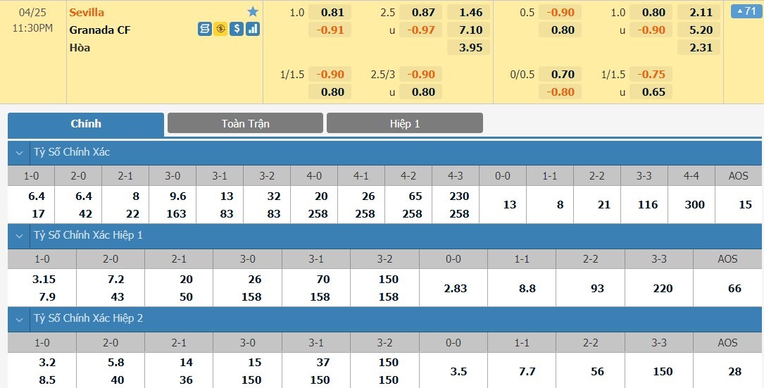 Tip kèo tỷ số hiệp 1: Sevilla 1-0 Granada