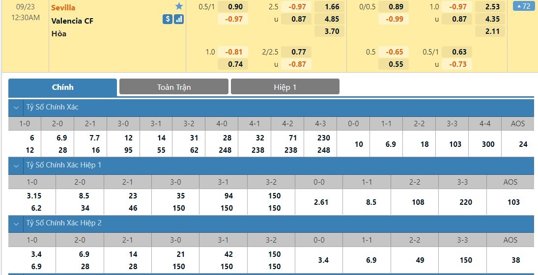 Tip kèo tỷ số hiệp 1: Sevilla 0-0 Valencia
