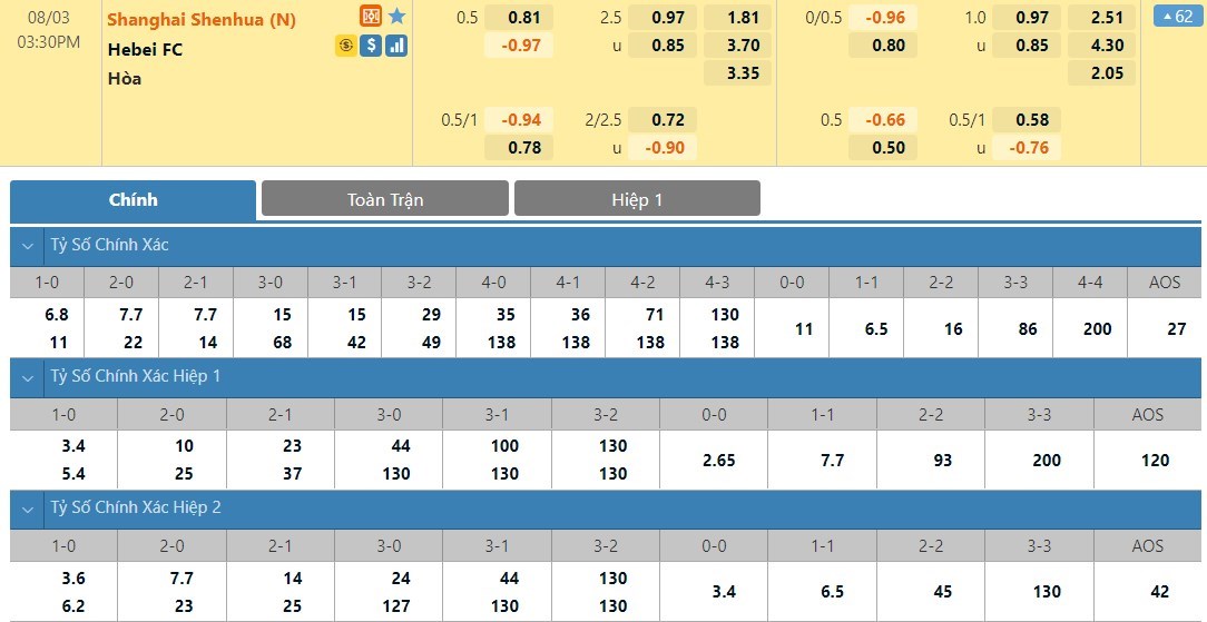 Tip kèo tỷ số hiệp 1: Shanghai Shenhua 1-0 Hebei FC