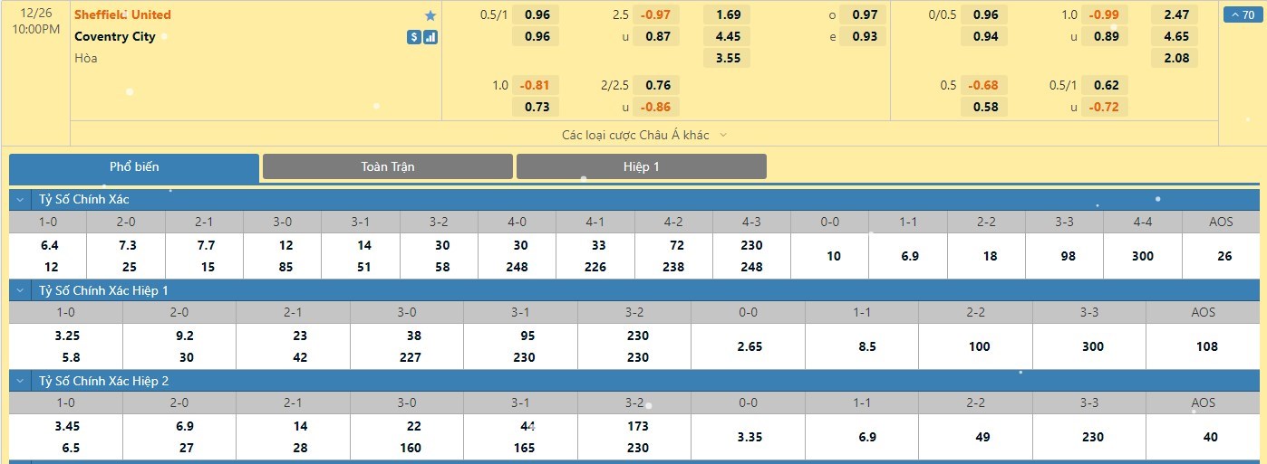 Trong 5 trận đấu gần nhất đôi bên đụng độ trực tiếp, nếu như Sheffield đã có 2 trận đấu mang về được cho mình ít nhất là 1 bàn thắng trong hiệp 1 thì Coventry chỉ có 1 lần làm được điều này trong 45 phút đầu tiên. Với tỷ lệ kèo hiệp 1 ở trận đấu này được đưa ra là -1/4 trái thì người chơi nên tin tưởng vào đội chủ nhà trận này.