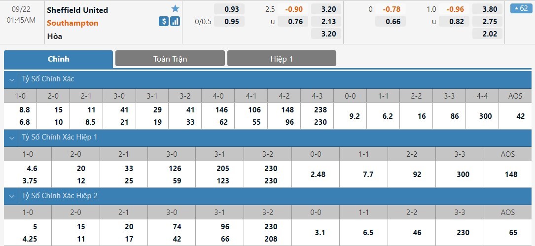 Tip kèo tỷ số hiệp 1: Sheffield United 0-2 Southampton