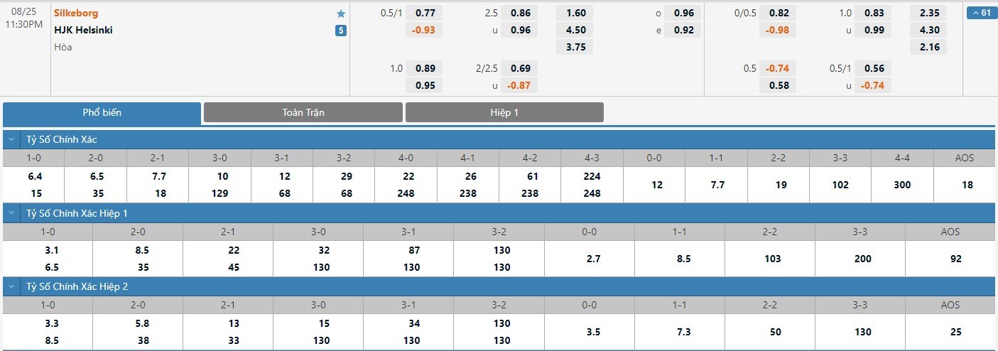 Tip kèo tỷ số hiệp 1: Silkeborg 1-1 HJK