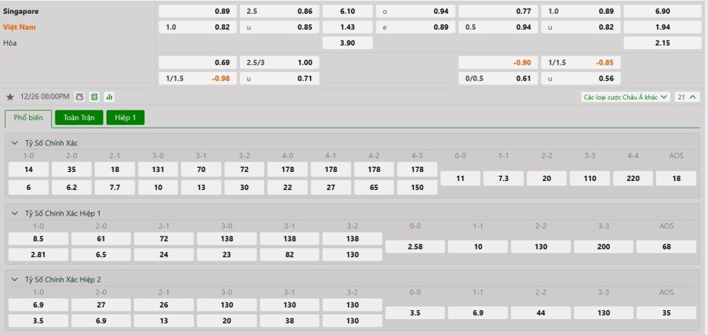 Tip kèo Châu Á hiệp 1: Chọn Singapore +1/2