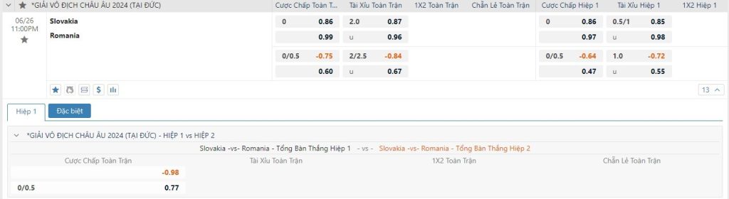 Tip kèo tỷ số hiệp 1: Slovakia 0-0 Romania