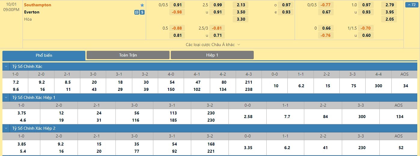 Trong 5 trận đấu gần nhất đôi bên đụng độ trực tiếp, nếu như Southampton đã có 3 trận đấu mang về được cho mình ít nhất là 2 bàn thắng trong hiệp đấu đầu tiên thì Everton chỉ có 1 lần làm được điều này trong 45 phút đầu tiên. Với tỷ lệ kèo hiệp 1 ở trận đấu này được đưa ra là -1/4 trái thì người chơi nên tin tưởng vào đội khách trận này.