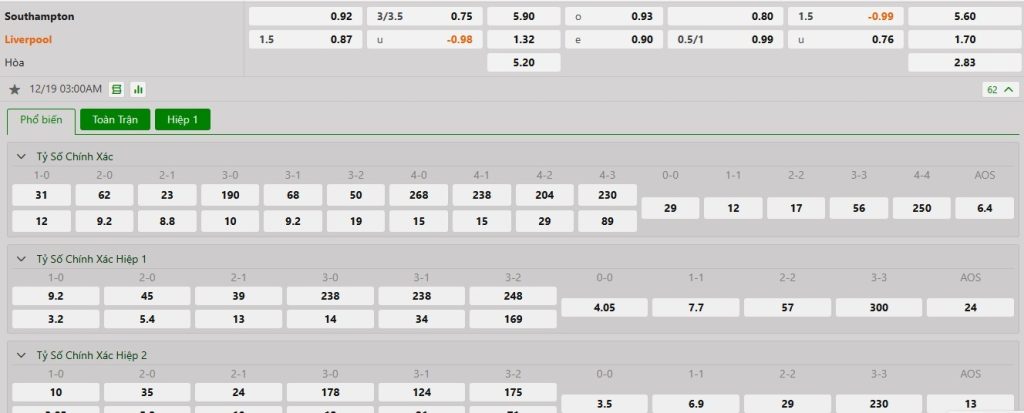 Tip kèo tỷ số hiệp 1: Southampton 0-1 Liverpool