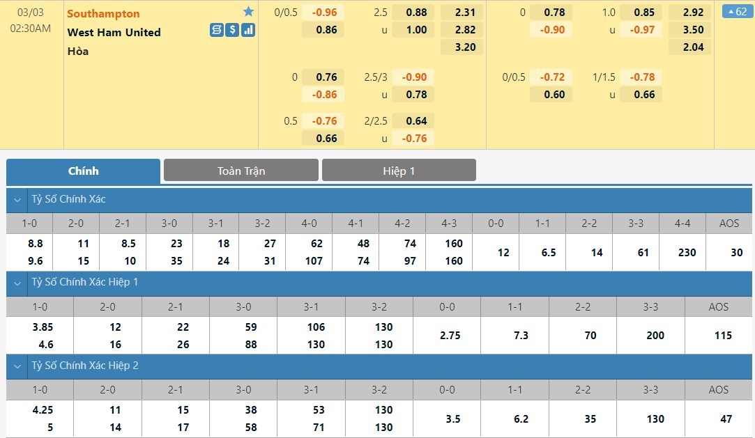 Tip kèo tỷ số hiệp 1: Southampton 1-1 West Ham United