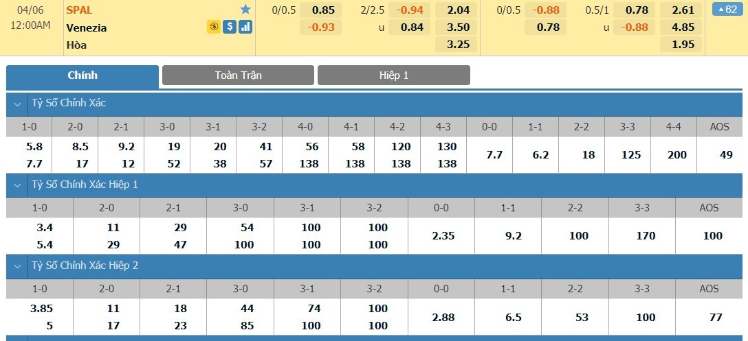 Tip kèo tỷ số hiệp 1: SPAL 2013 0-0 Venezia