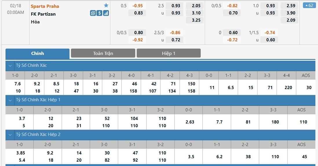 Tip kèo tỷ số hiệp 1: Sparta Praha 1-1 Partizan Belgrade