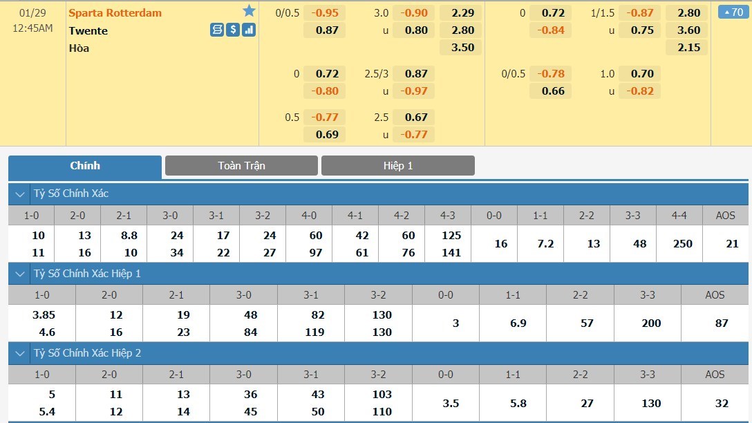 Trong 4 vòng đấu gần đây tại giải VĐQG Hà Lan, Sparta Rotterdam chỉ mang về 1 chiến thắng, còn lại là 3 thất bại. Tính kể từ đầu mùa, số trận thua của Sparta Rotterdam đã lên tới con số 9 - chiếm một nửa số trận đã đấu. Càng đáng trách hơn khi những trận thua gần đây của Sparta Rotterdam lại diễn ra trên chính sân nhà. Rõ ràng tuy vẫn được xếp ở thế chiếu trên trong cuộc đọ sức với Twente nhưng nhìn vào cách ra kèo của đội ngũ thiết lập tỷ lệ chỉ dừng lại ở con số -1/4 bàn thì khả năng thắng trận của Sparta Rotterdam cũng đang bị đặt nhiều nghi vấn.