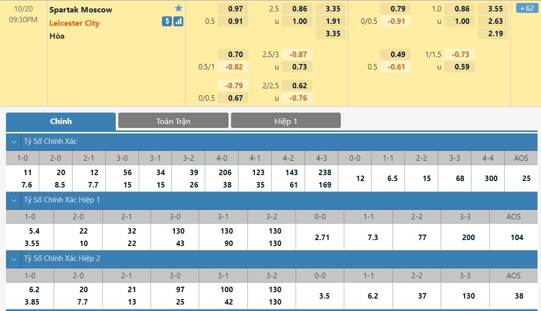 Tip kèo tỷ số hiệp 1: Spartak Moscow 1-1 Leicester City