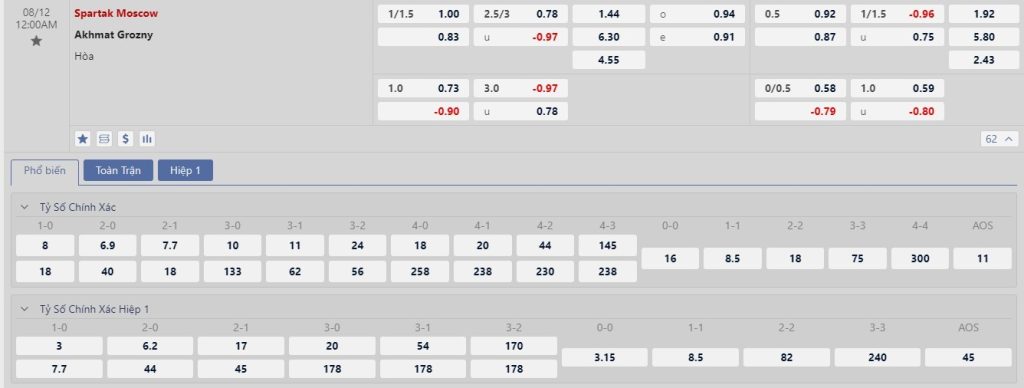 Spartak dĩ nhiên là những người nhận được đánh giá cao hơn từ phía đội ngũ chuyên môn. Với kèo chấp sâu 1 1/4 trái mà nhà cái đưa ra thì có thể thấy được rằng đội ngũ chuyên môn đặt niềm tin lớn vào một chiến thắng dành cho đại diện thủ đô. Với hai hình ảnh tương phản của đôi bên thì thật sự quá khó để hy vọng vào một viễn cảnh tươi sáng dành cho Akhmat Grozny. Sân nhà đang là điểm tựa vững chãi dành cho Spartak. Thống kê chỉ ra rằng Spartak toàn thắng 5 trận sân nhà gần nhất tính trong phạm vi các giải đấu chính thức. Hàng tấn công đang vào phom của Spartak hoàn toàn đủ sức tạo ra sức ép mạnh mẽ để giành lợi thế dẫn bàn sớm ngay trong hiệp 1.