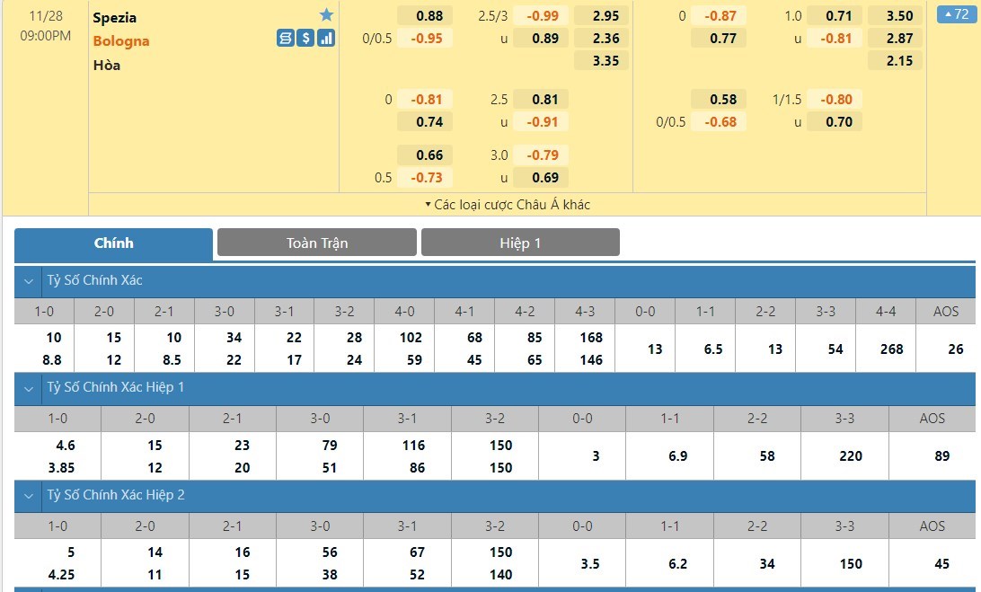 Tip kèo tỷ số hiệp 1: Spezia 0-0 Bologna