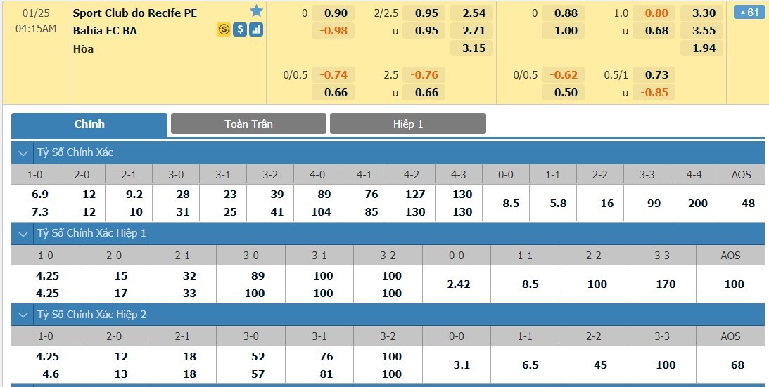 Cả 2 đội bóng cùng có cách nhập cuộc không hề tốt. Sport Recife có tới 11 lần bước vào giờ nghỉ với việc bị dẫn trước còn con số này phía Bahia là tới 13. Chính vì thế, khả năng cao đôi bên sẽ cùng hài lòng nếu ta có được 1 kết quả cân bằng khi bước vào giờ nghỉ.