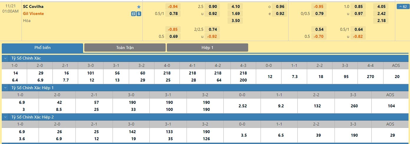 Trong 5 trận đấu gần nhất đôi bên đụng độ nhau trực tiếp, Sporting Covilha đã có 2 trận đấu mang về được cho mình ít nhất là 1 bàn thắng trong hiệp đấu đầu tiên. Còn với Gil Vicente, đội bóng này chỉ có 1 lần làm được điều này trong 45 phút đầu tiên. Với tỷ lệ kèo hiệp 1 ở trận đấu này được đưa ra là -1/4 trái thì người chơi nên tin tưởng vào đội chủ nhà trận này.