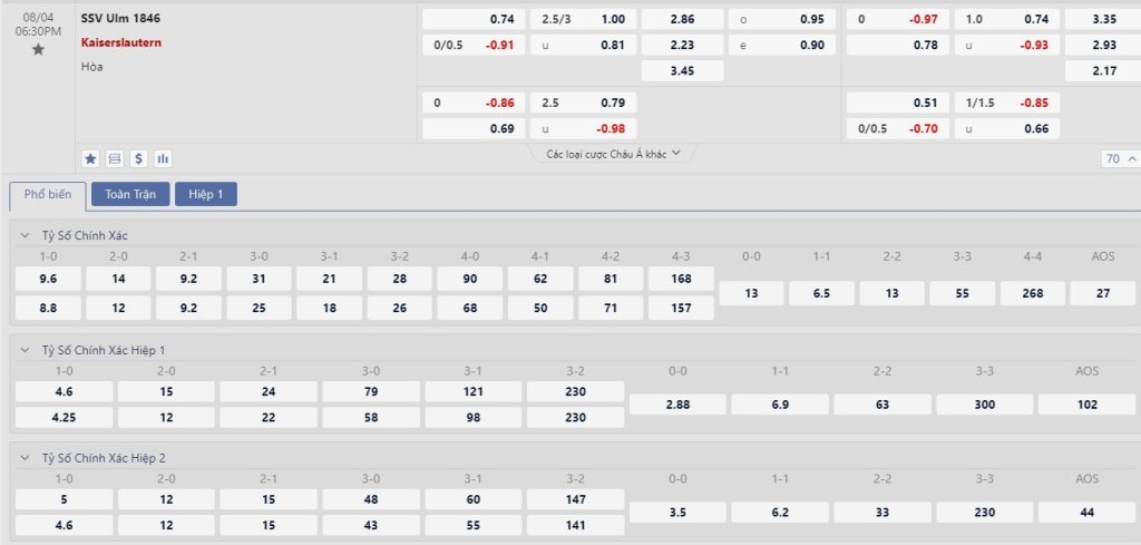 Tip kèo tỷ số hiệp 1: SSV Ulm 1846 1-1 Kaiserslautern