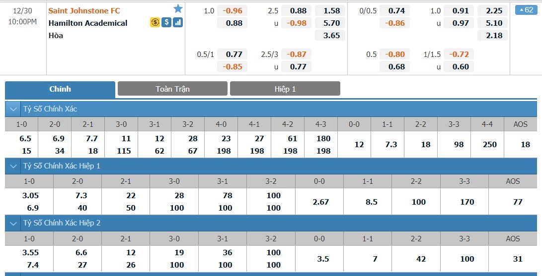 Tip kèo tỷ số hiệp 1: St. Johnstone 2-1 Hamilton Academical