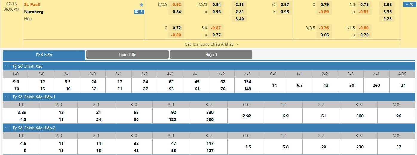 Tỷ lệ kèo được đưa ra ở cuộc đối đầu này là -1/4 trái và rõ ràng St. Pauli vẫn là đội bóng được đánh giá cao hơn. Nên nhớ rằng, St. Pauli cũng là đội bóng có được cho mình 3 thắng lợi ở 5 lần gần nhất hai đội bóng này chạm trán trực tiếp với nhau. Do đó, các nhà đầu tư nên tin tưởng vào đoàn quân của HLV Timo Schultz để có sự an toàn lớn hơn.