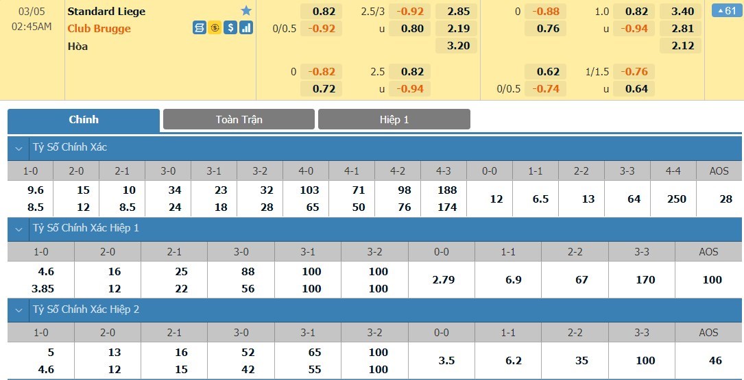 Tip kèo tỷ số hiệp 1: Standard Liege 0-1 Club Brugge