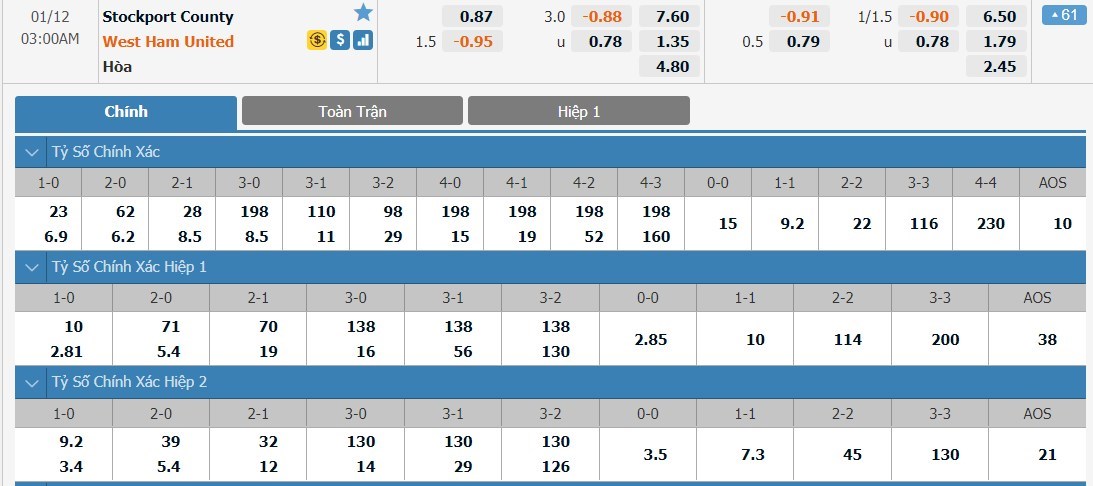 Tip kèo tỷ số hiệp 1: Stockport 0-1 West Ham United