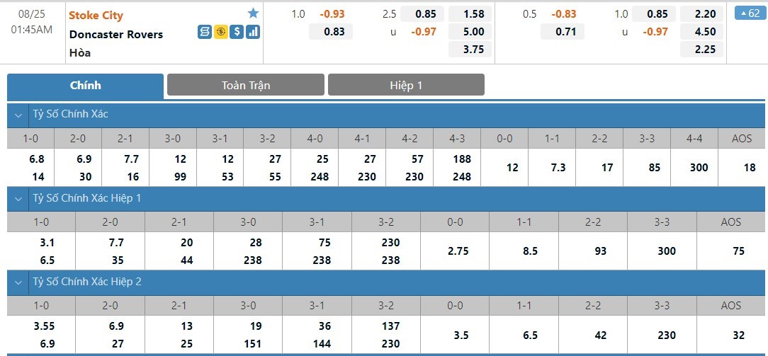 Tip kèo tỷ số hiệp 1: Stoke 2-0 Doncaster