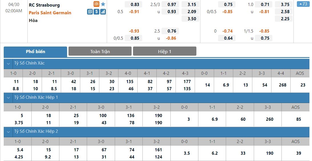Tip kèo tỷ số hiệp 1: Strasbourg 1-1 Paris Saint-Germain